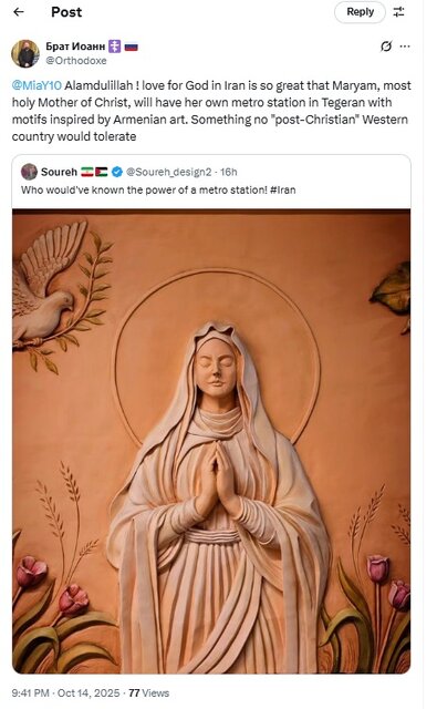 کاربر دیگری به نام سنت آداگویله که در شبکه اجتماعی ایکس خود را مسیحی کاتولیک معرفی کرده است، از ایجاد یک ایستگاه مترو با المانهای مربوط به حضرت مریم استقبال و اعلام کرد: ایران از ایستگاه متروی جدید «مریم مقدس» در تهران که با نمادهای مسیحی تزئین شده است، رونمایی کرد. او در ادامه به زبان اسپانیایی نوشت «درود بر مریم».