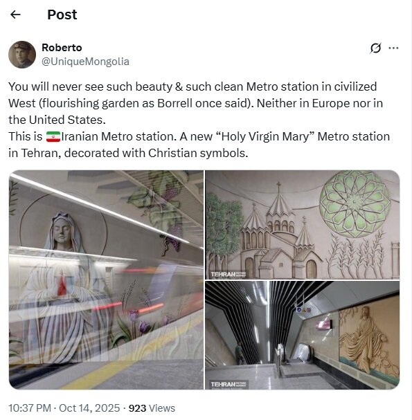 رابرتو، کاربر روس دیگری است که دراینباره نوشت: شما هرگز چنین ایستگاه متروی زیبا و تمیزی را در غرب متمدن (باغ شکوفا، همانطور که بورل زمانی گفته بود) نخواهید دید. نه در اروپا و نه در ایالاتمتحده. این ایستگاه متروی ایرانی است. یک ایستگاه متروی جدید «مریم مقدس» در تهران که با نمادهای مسیحی تزئین شده است.