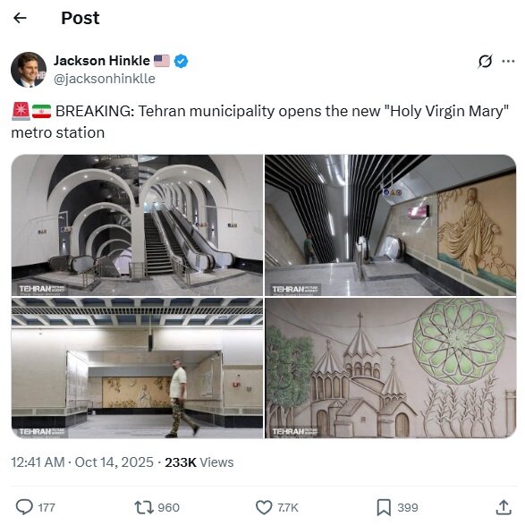 جکسون هینکل، کاربر آمریکایی ایکس در پیام خود تصاویری از ایستگاه جدید متروی تهران منتشر کرد و نوشت: خبر فوری؛ شهرداری تهران ایستگاه جدید متروی «مریم مقدس» را افتتاح کرد.