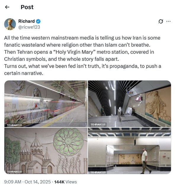 رچارد، نام کاربر دیگری است که در پیامی درباره ایستگاه مریم مقدس نوشت: رسانههای جریان اصلی غرب مدام به ما میگویند که ایران چگونه یک سرزمین بایر متعصب است که در آن دینی غیر از اسلام نمیتواند نفس بکشد. سپس تهران یک ایستگاه مترو با نام «مریم مقدس» افتتاح میکند که پوشیده از نمادهای مسیحی است و کل داستان از هم میپاشد. مشخص میشود آنچه به ما خورانده شده حقیقت نیست، بلکه تبلیغات است، برای پیشبرد یک روایت خاص.