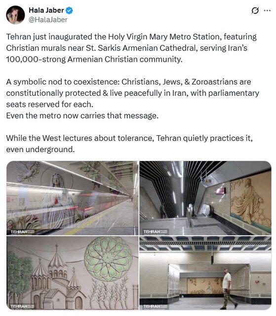 بنا به گزارش ایسنا، حلا جابر، نویسنده انگلیسی در صفحه شخصی خود در ایکس نوشت: تهران بهتازگی ایستگاه متروی مریم مقدس را افتتاح کرده است که نقاشیهای دیواری مسیحی را در نزدیکی کلیسای جامع ارمنی سنت سرکیس به نمایش میگذارد و به جامعه ۱۰۰ هزار نفری ارمنی مسیحی ایران خدمترسانی میکند.