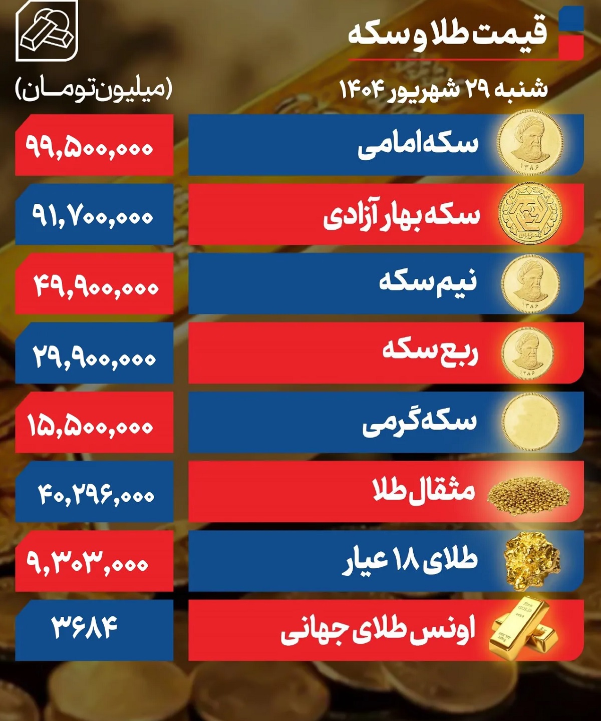 به گزارش جریان آنلاین، طلا و سکه امروز شنبه ۲۹ شهریور ۱۴۰۴ با جهش قیمتی بازگشایی شد. قیمت طلا بیش از نیم میلیون تومان رشد کرد و طلای ۱۸ عیار به قله ۹.۳ میلیونی رسید. قیمت سکه نیز در تمامی قطعات رشد بیسابقهای داشت و سکه امامی در قله ۹۹ میلیونی قرار گرفت.