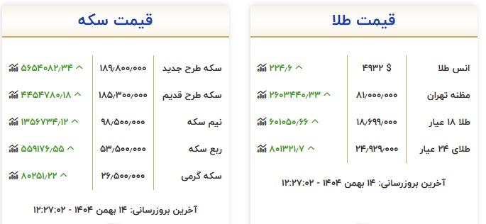 به گزارش ایرنا، در بازار مسکوکات طلا نیز هر قطعه سکه تمام طرح جدید ۱۸۹ میلیون و ۸۰۰ هزار تومان و هر قطعه سکه طرح قدیم ۱۸۵ میلیون و ۳۰۰ هزار تومان معامله شد که در طرح جدید ۵ میلیون و ۶۵۴ هزار تومان و در طرح قدیم ۴ میلیون و ۴۵۴ هزار تومان افزایش قیمت ثبت شد؛ نیم سکه نیز با رشد یک میلیون و ۳۵۶ هزار تومانی در کانال ۹۸ میلیون و ۵۰۰ هزار تومان قرار گرفت.