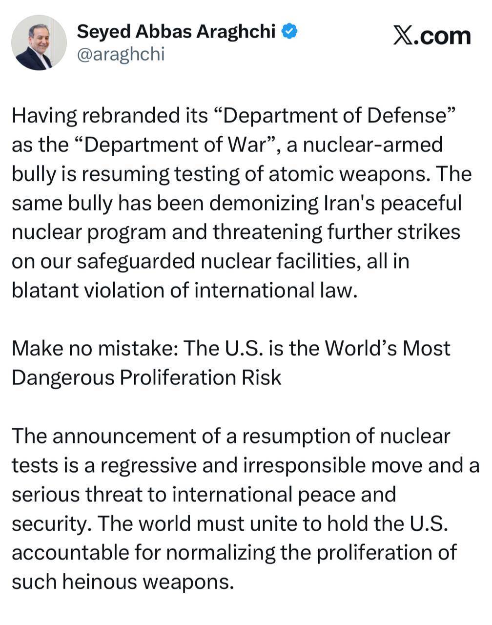 عراقچی در ادامه نوشتهاش آورد: جهان باید یکصدا ایالاتمتحده را بهخاطر عادیسازی اشاعه چنین سلاحهای شرورانهای مسئول بشناسد.