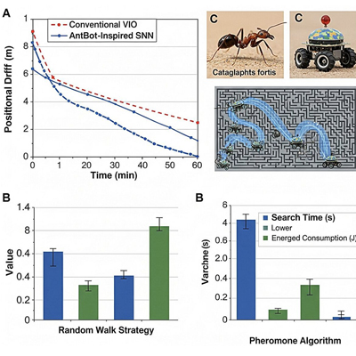مورچهوار گامشماری: یک شبکه عصبی کممصرف و مقاوم به نویز که مثل مورچههای صحرایی با شمارش دقیق گامها و جهت، حتی در بیابان پرآشوب مسیر را گم نمیکند. مورچهها به کمک شمارش گامها و جهت حرکت، موقعیت خود را نسبت به لانه تشخیص میدهند و حتی در محیطهای آشفته مسیر را گم نمیکنند. آزمایشها نشان داد خطای این روش در بیابان چندین برابر کمتر از روشهای معمول دوربین و IMU است.