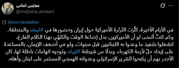 این اظهارنظر مجتبی امانی در واکنش به موج جدیدی از مواضع آمریکاییها درباره نقش ایران در لبنان و منطقه مطرح شده است؛ مواضعی که همزمان با تشدید حملات رژیم صهیونیستی به جنوب لبنان و افزایش تنش در مرزهای فلسطین اشغالی، بار دیگر تلاش دارد حضور ایران را بهعنوان عامل بیثباتی معرفی کند.