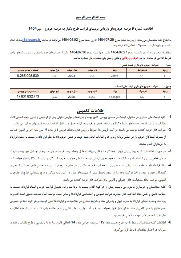 به گزارش جریان آنلاین؛ طبق اطلاعیه سامانه تخصیص خودروهای وارداتی، متقاضیان تا تاریخ 2 آبان مهلتدارند که با مراجعه به سامانه فروش خودروهای وارداتی به نشانی Salecars.ir، ثبتنام نموده و نسبت به انتخاب ۲ اولویت از سبد محصولات اعلامی اقدام کنند. بر اساس این اطلاعیه معرفی یک حساب وکالتی با مبلغ 500 میلیون تومان موجودی جهت بلوکه شدن تا پایان امروز 30 مهر الزامی میباشد.
